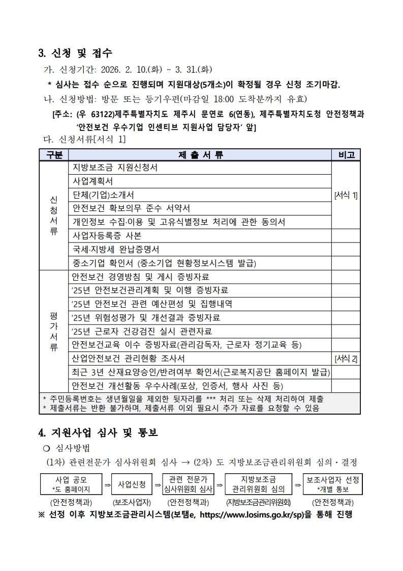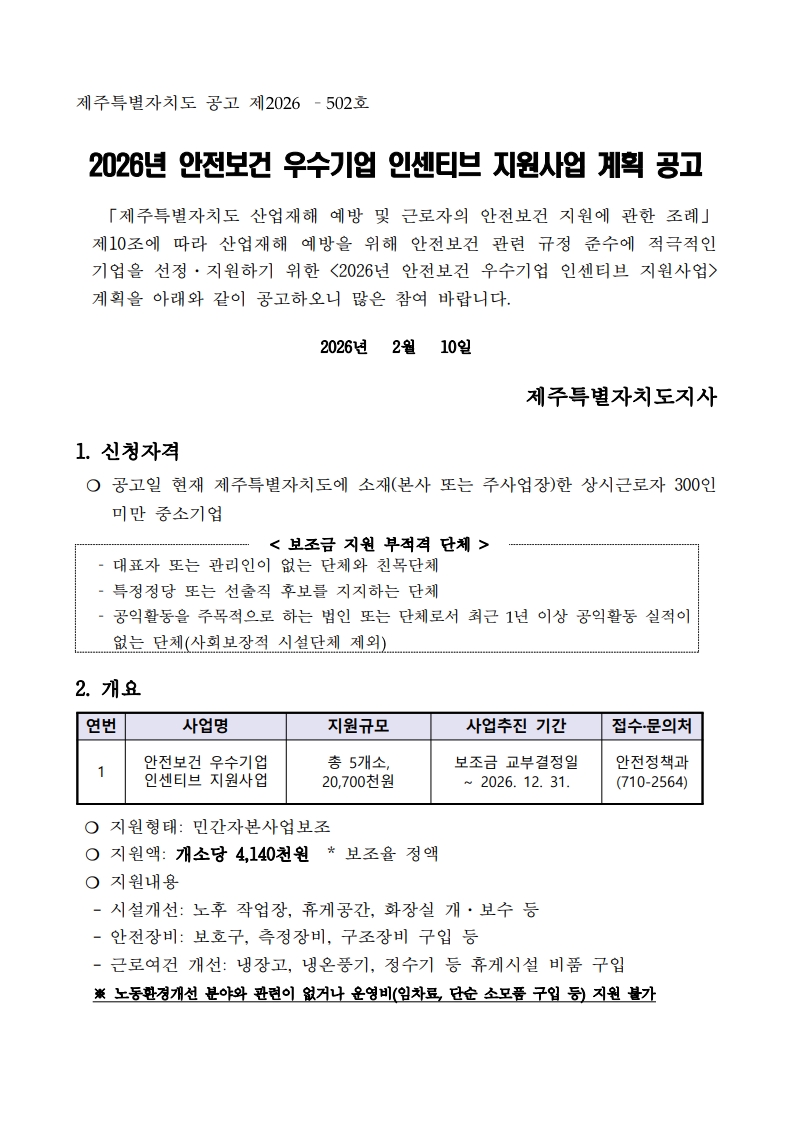 제주특별자치도에서 진행하는 산업재해 예방을 위해 안전보건 관련 규정 준수에 적극적인 기업을 선정·지원하기 위한 <2026년 안전보건 우수기업 인센티브 지원사업>을 안내드립니다.