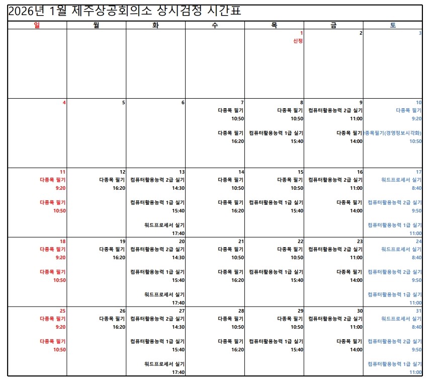 | 제목 | (알림) 제주상공회의소 2026년 1월 국가기술자격시험 일정 | ||