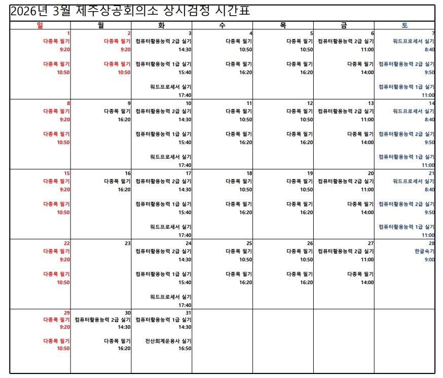 | ‒ | (알림) 제주상공회의소 2026년 3월 국가기술자격시험 일정 |