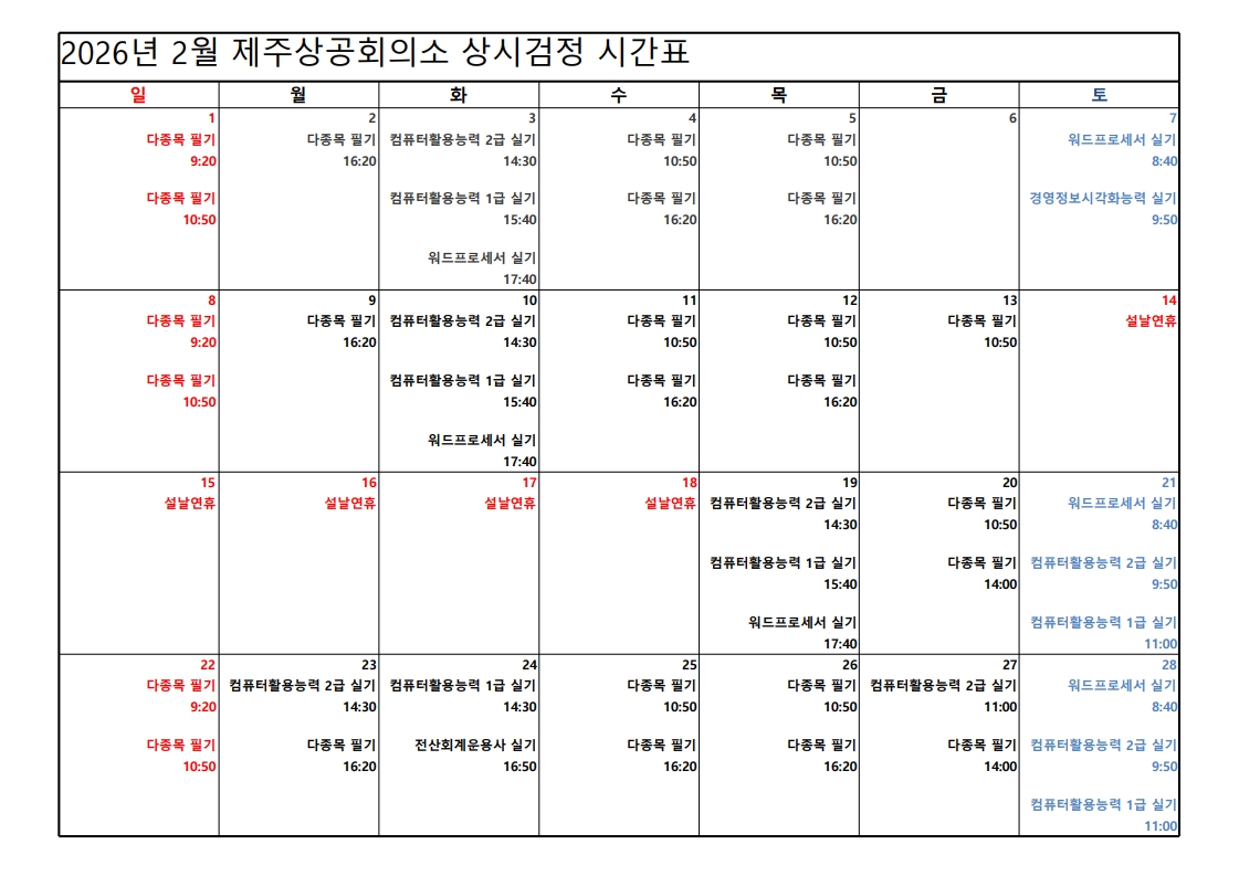 | 제목 | (알림) 제주상공회의소 2026년 3월 국가기술자격시험 일정 | ||