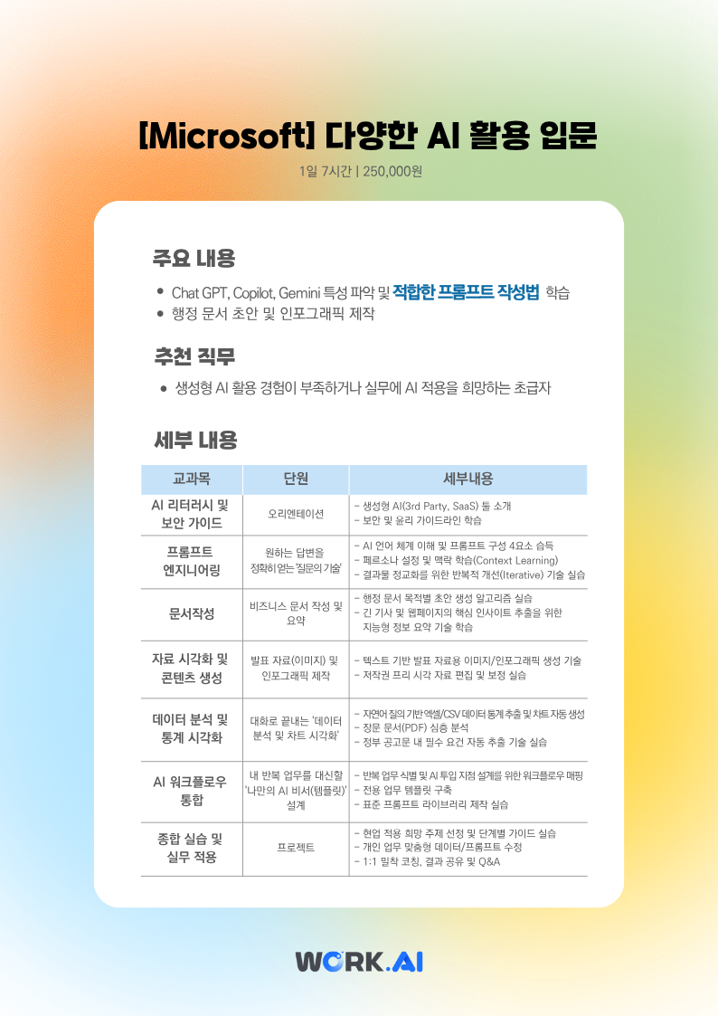 | 제목 | (3월 23일) [Microsoft] 다양한 AI 활용 입문(교육비 95% 환급 과정) | ||